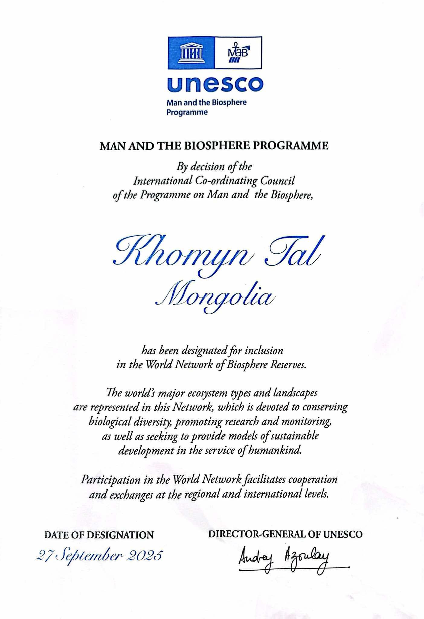 At the 37th session of UNESCO’s International Co-ordinating Council of the Programme on Man and the Biosphere (MAB), held in Hangzhou, China on 26–28 September 2025, Khomyn Tal National Park was officially designated for inclusion in the World Network of Biosphere Reserves. The certificate was received by B. Chinuukhei, Secretary-General, Mongolian National Commission for UNESCO and Ts. Munkhbat, Director of the Khomyn Tal NP’s Administration.