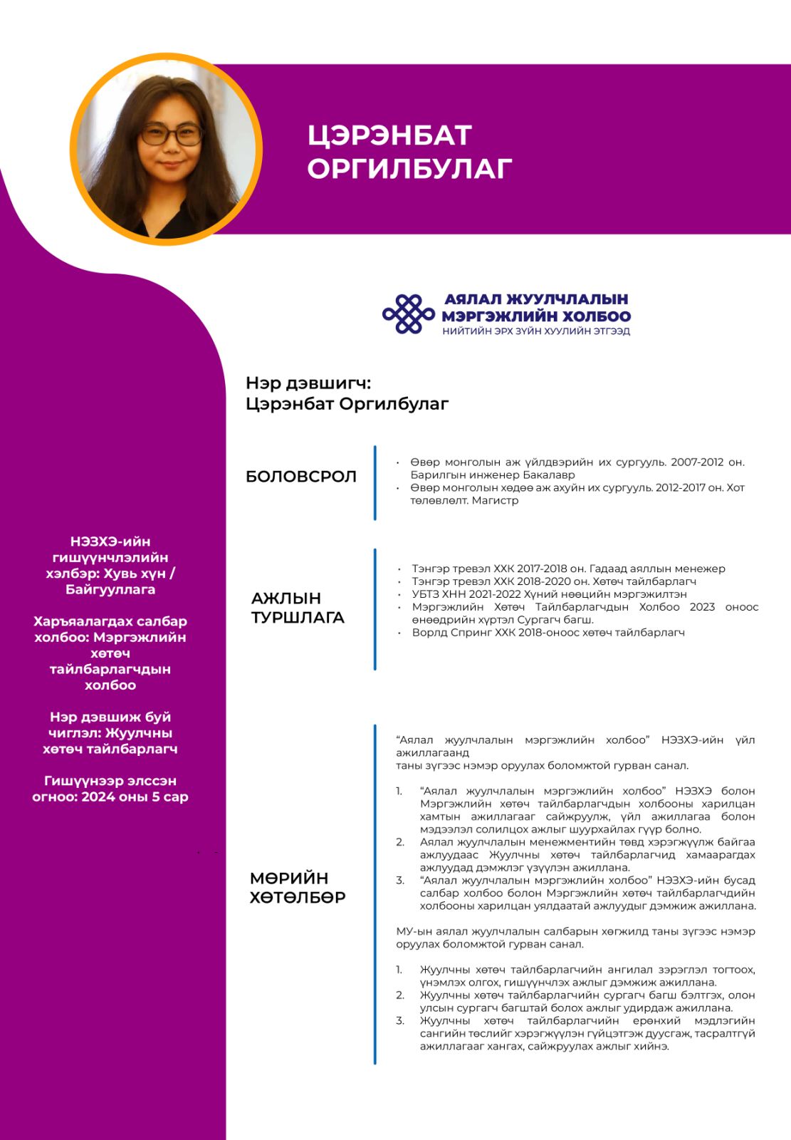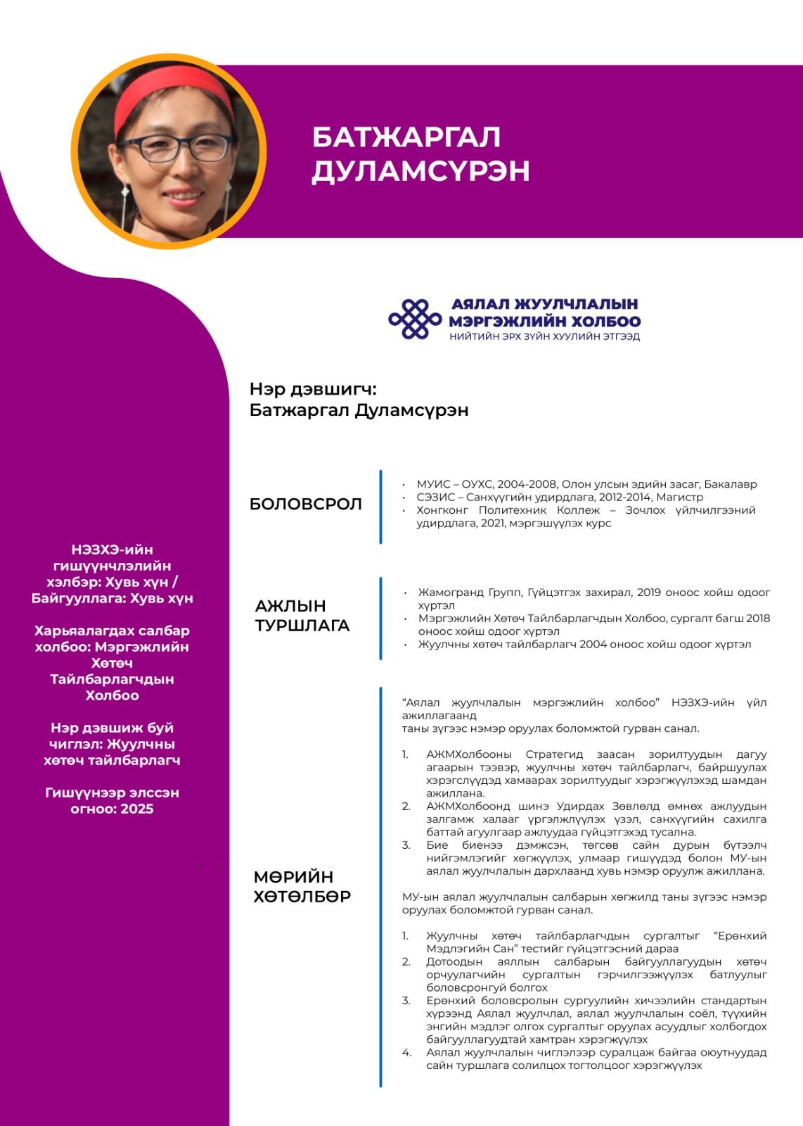 АЯЛАЛ ЖУУЛЧЛАЛЫН БАГШ, СУДЛААЧ НАРЫН ТӨЛӨӨЛЛӨӨР УДИРДАХ ЗӨВЛӨЛИЙН СОНГУУЛЬД НЭР ДЭВШИГЧ НАРЫН АНКЕТ