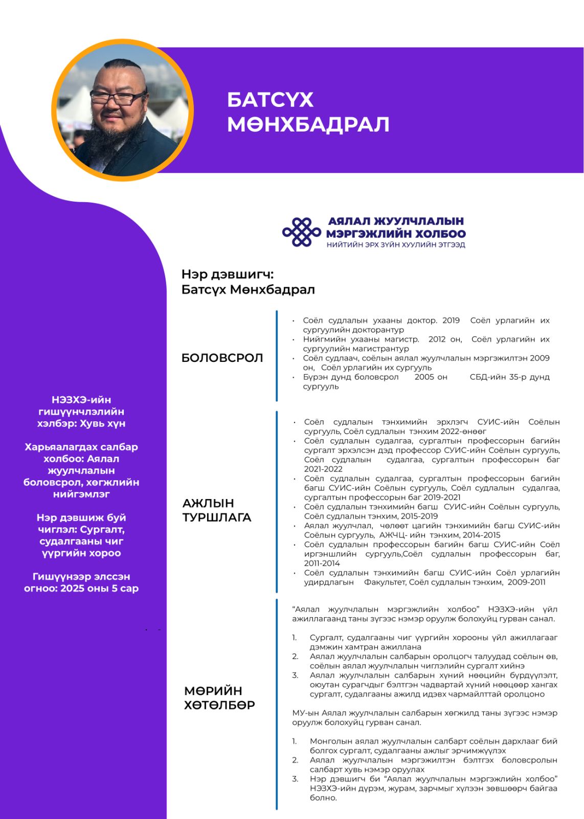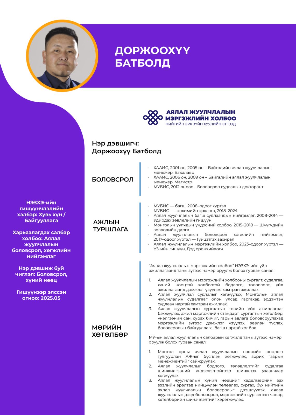 АЯЛАЛ ЖУУЛЧЛАЛЫН БАГШ, СУДЛААЧ НАРЫН ТӨЛӨӨЛЛӨӨР УДИРДАХ ЗӨВЛӨЛИЙН СОНГУУЛЬД НЭР ДЭВШИГЧ НАРЫН АНКЕТ
