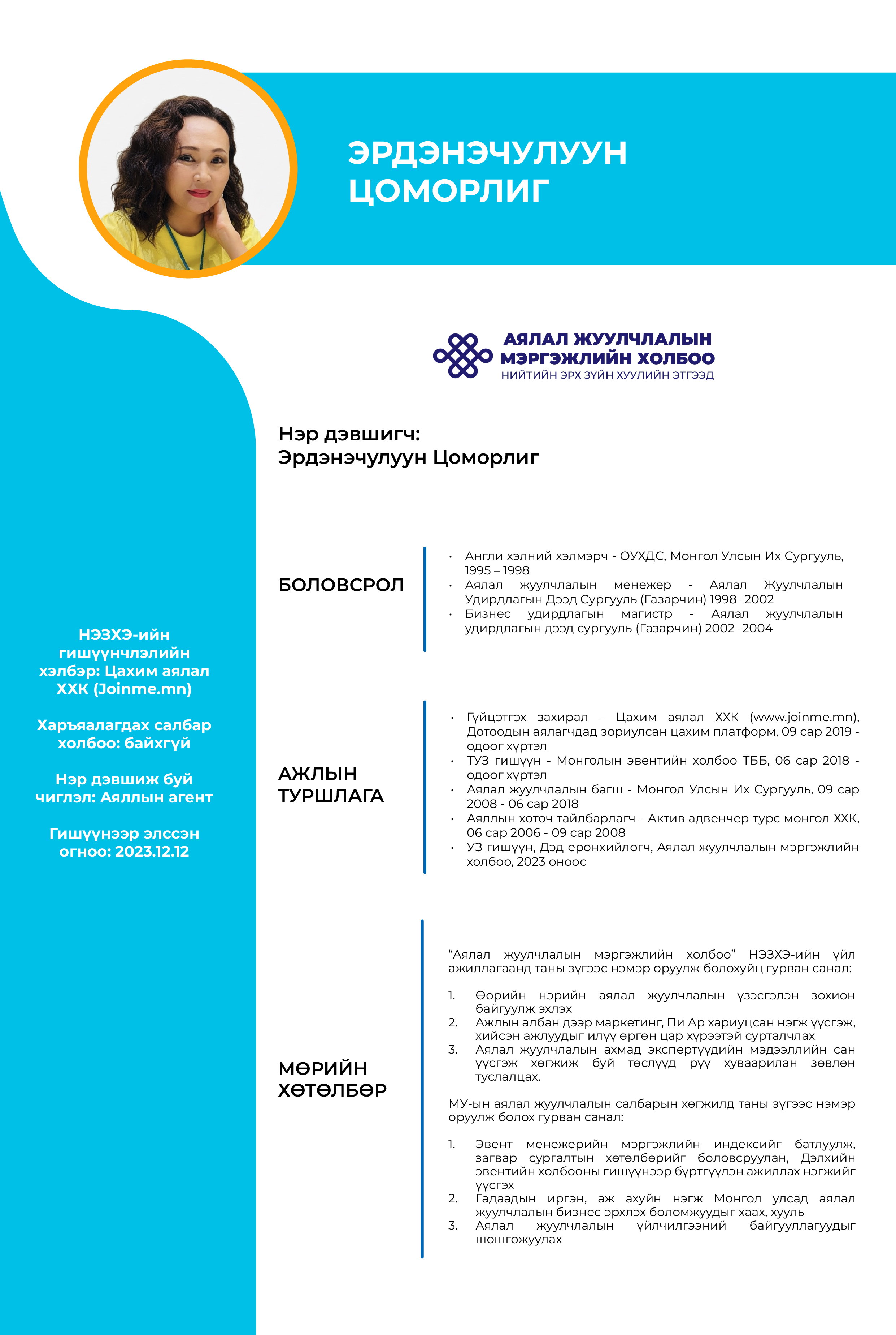 АЯЛАЛ ЖУУЛЧЛАЛЫН БАГШ, СУДЛААЧ НАРЫН ТӨЛӨӨЛЛӨӨР УДИРДАХ ЗӨВЛӨЛИЙН СОНГУУЛЬД НЭР ДЭВШИГЧ НАРЫН АНКЕТ
