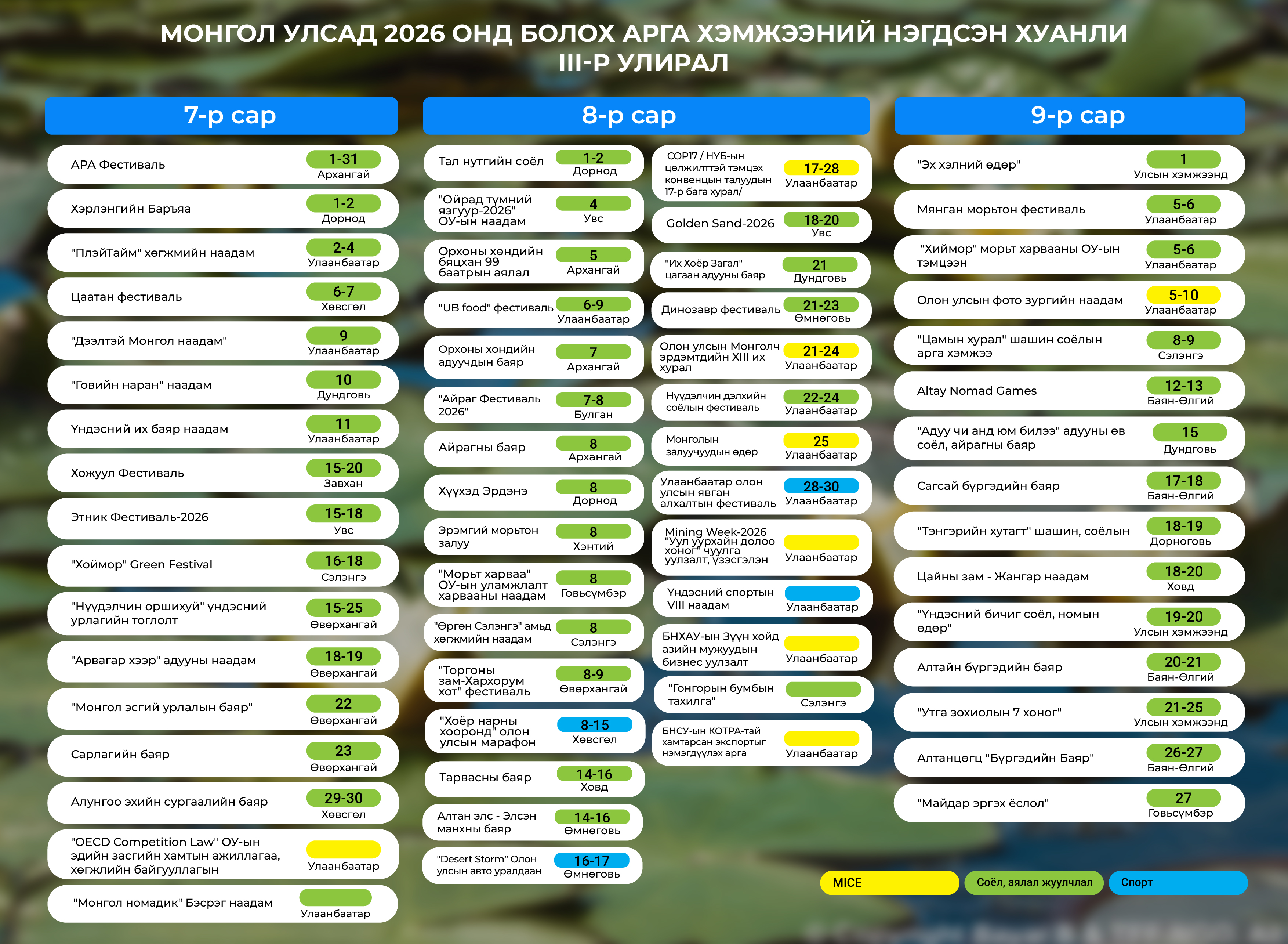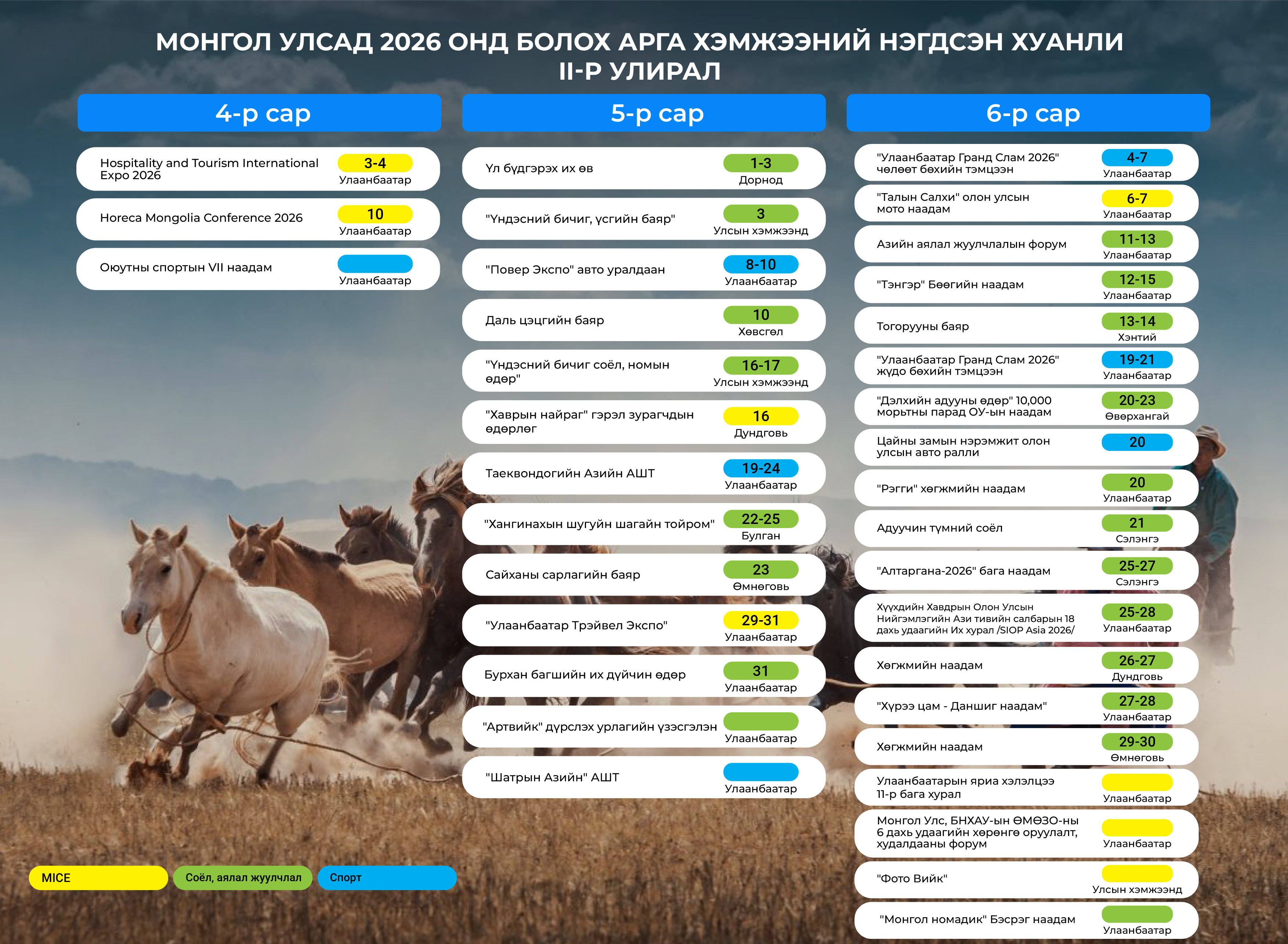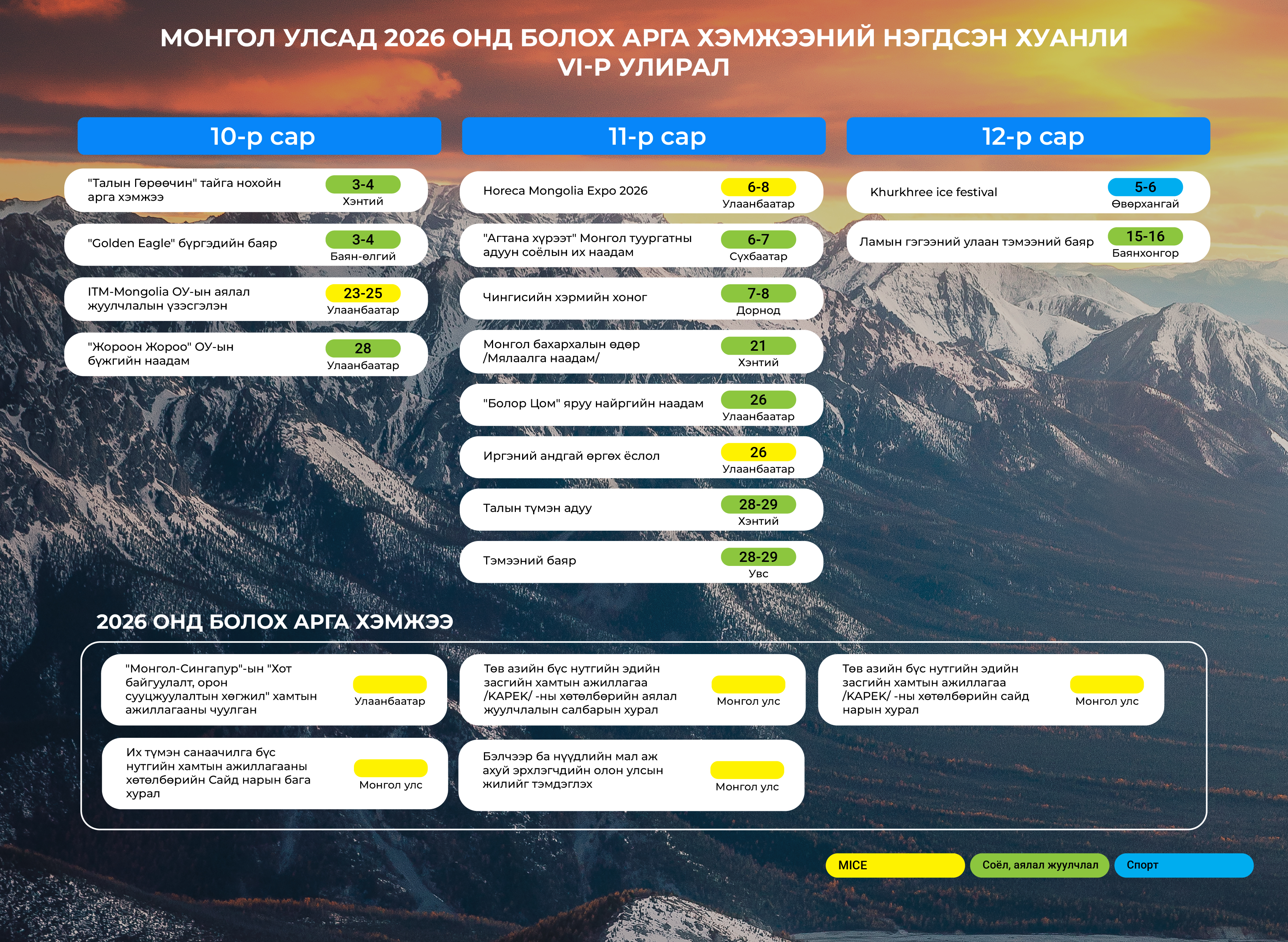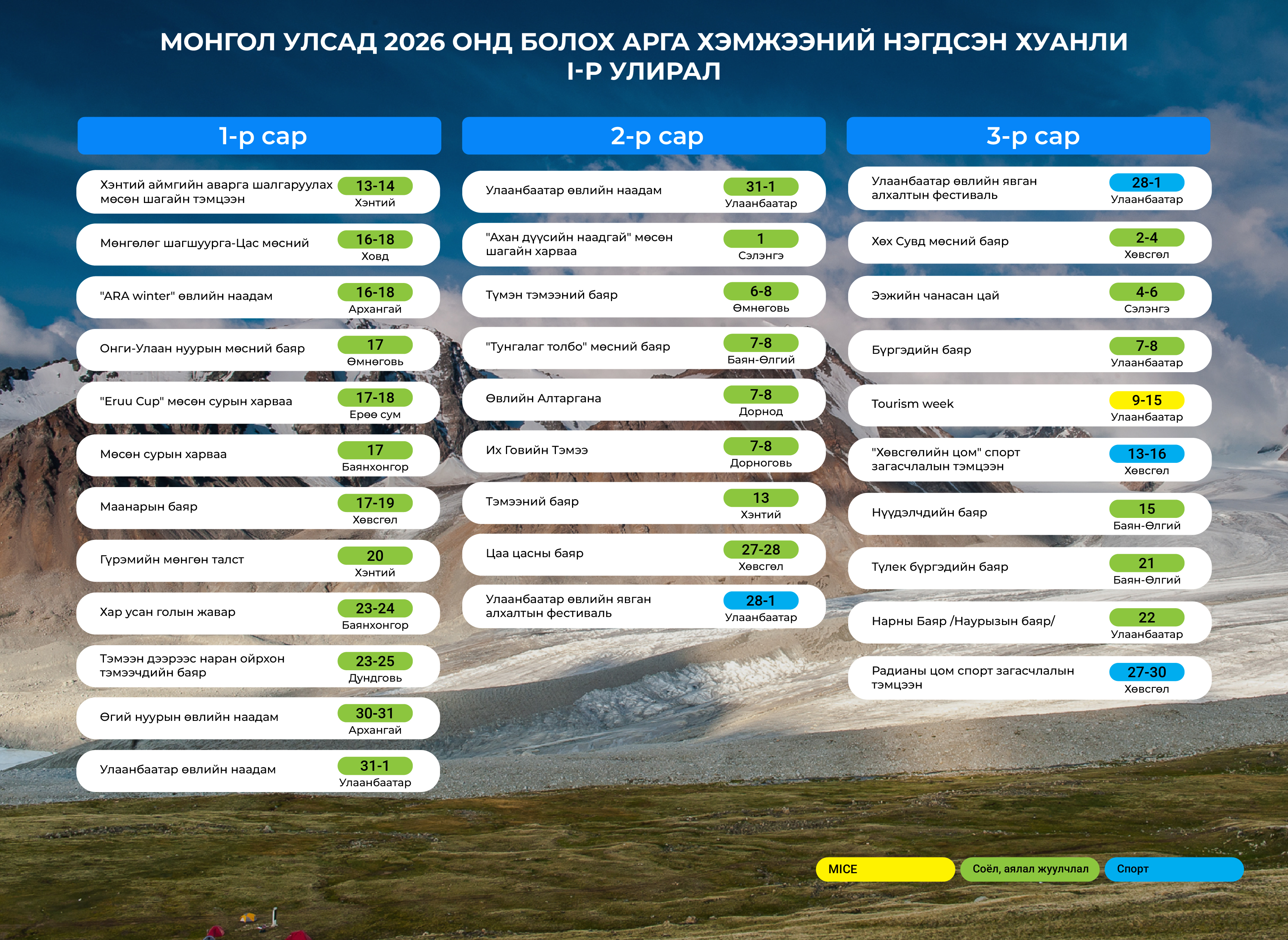 Монгол Улсад 2026 оны турш зохион байгуулагдах соёл, аялал жуулчлал, спорт, олон улсын чиглэлийн томоохон арга хэмжээнүүдийг нэгтгэсэн нэгдсэн хуанли боловсруулагдан олон нийтэд танилцуулагдлаа.