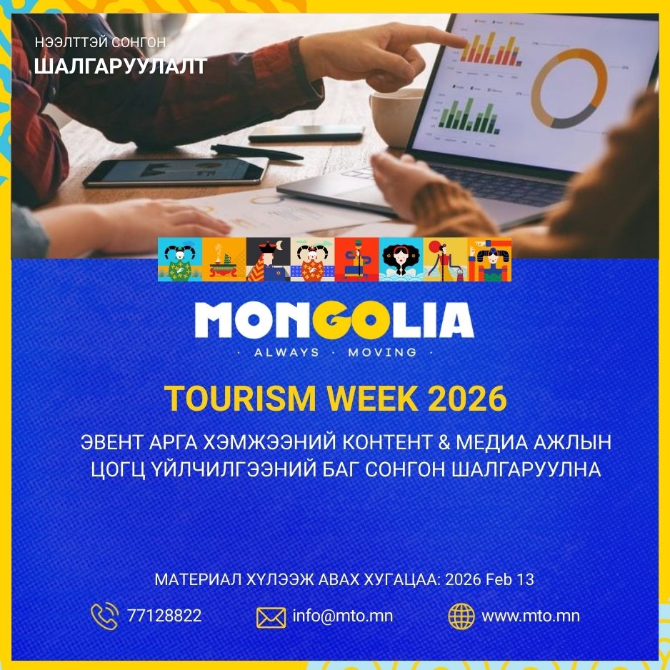 “Tourism Week 2026” эвентийн хүрээнд 2026 оны 3 дугаар сарын 9-ний өдөр зохион байгуулагдах 150 хүний хүлээн авалтын арга хэмжээ-г хэрэгжүүлэхэд контент болон видео, олон нийтэд мэдээлэл хүргэх зэрэг цогц үйлчилгээний газрыг нээлттэй сонгон шалгаруулна.