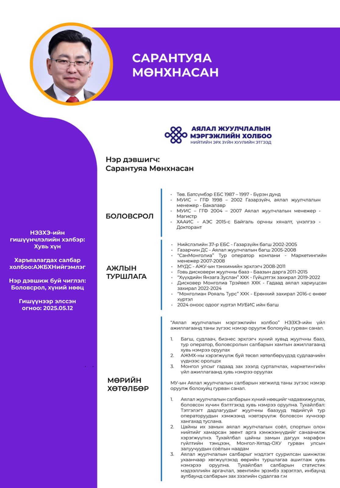 АЯЛАЛ ЖУУЛЧЛАЛЫН БАГШ, СУДЛААЧ НАРЫН ТӨЛӨӨЛЛӨӨР УДИРДАХ ЗӨВЛӨЛИЙН СОНГУУЛЬД НЭР ДЭВШИГЧ НАРЫН АНКЕТ