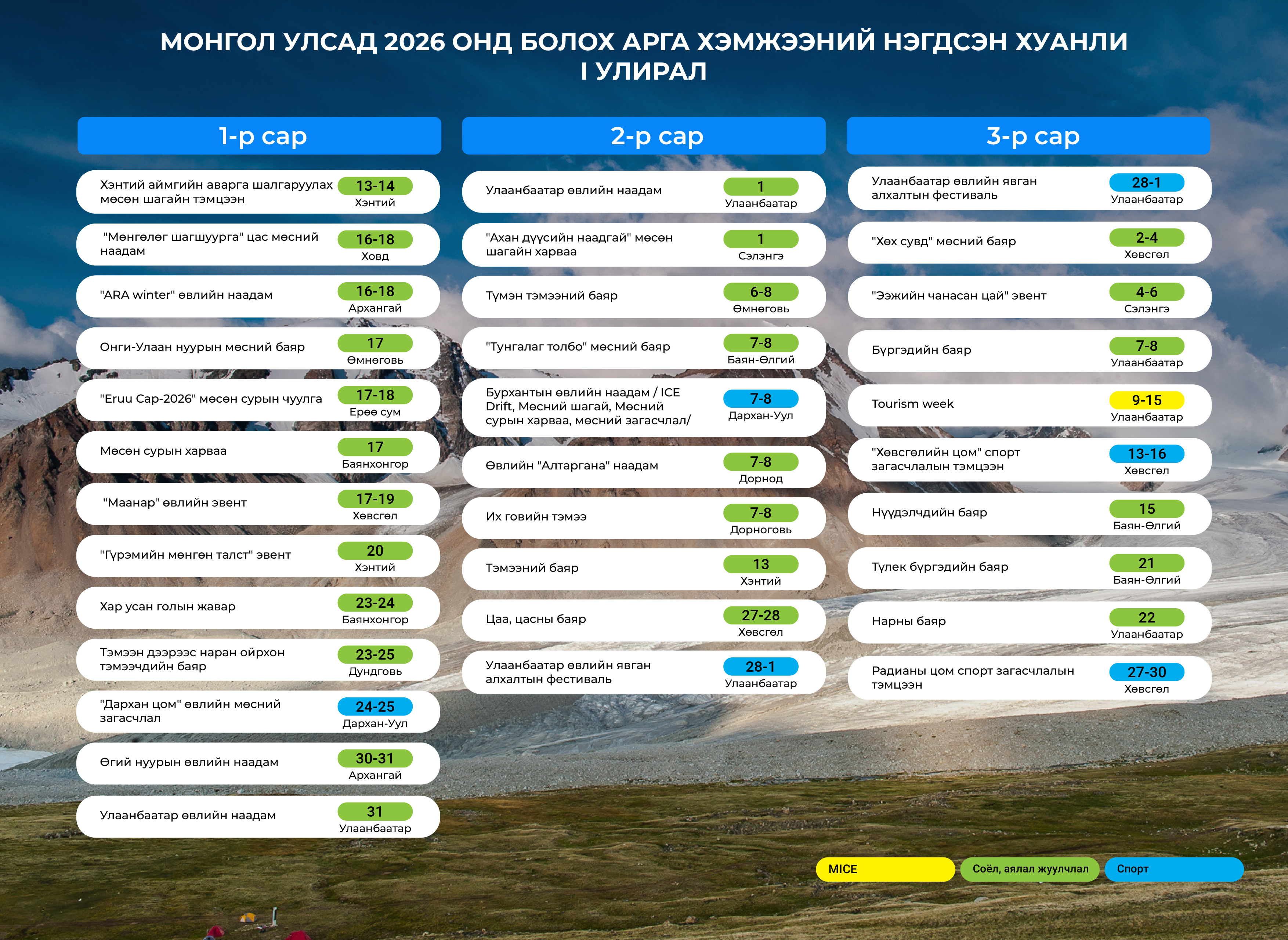 Монгол Улсад 2026 оны турш зохион байгуулагдах соёл, аялал жуулчлал, спорт, олон улсын чиглэлийн томоохон арга хэмжээнүүдийг нэгтгэсэн нэгдсэн хуанли боловсруулагдан олон нийтэд танилцуулагдлаа.